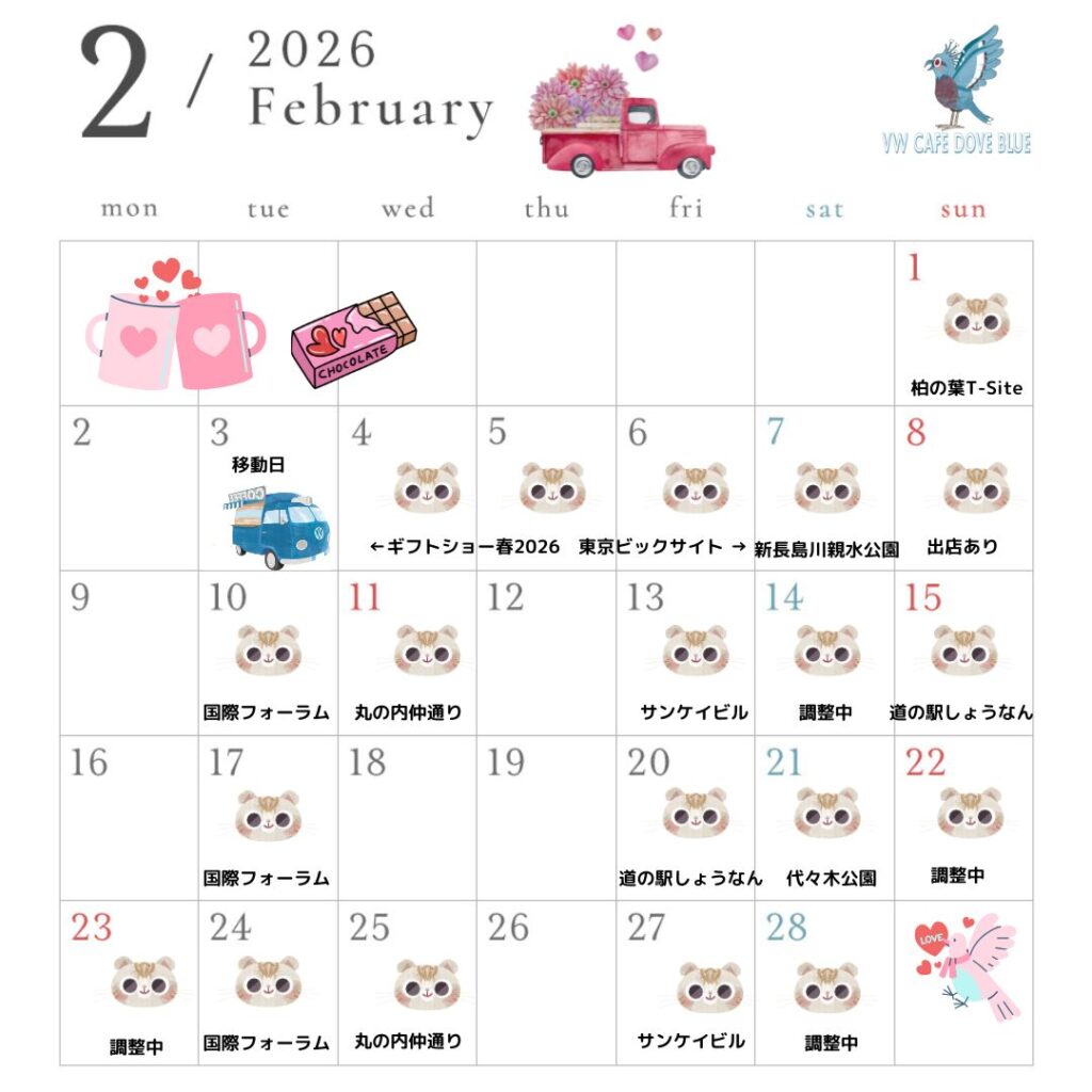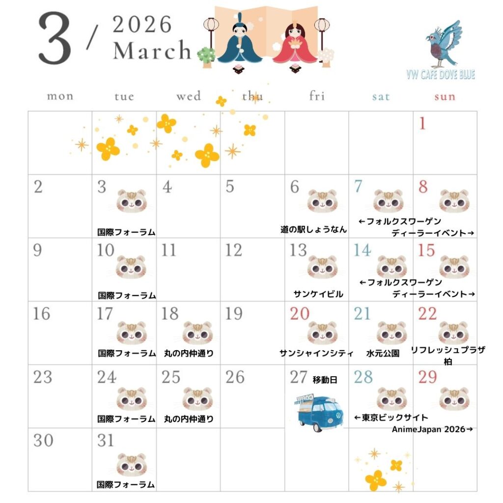 VW CAFE DOVE BLUE の出店スケジュールです!!